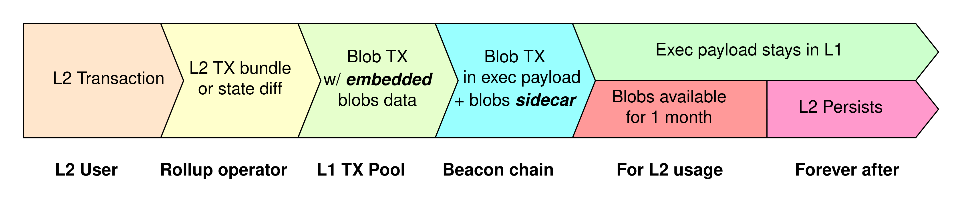 The primary aim of blobs is to significantly reduce Data Availability (DA) costs, especially for Layer 1 (L1) publication of rollups. Unlike the traditional approach where all rollup data resides in Ethereum’s calldata space, blobs offer an efficient and cost-effective alternative. Since the consensus layer manages blob storage, blob transactions impose no additional demands on validators. Moreover, blob data is automatically deleted within a suggested timeframe of 30 to 60 days, aligning with Ethereum’s goal of scalability rather than indefinite data storage.