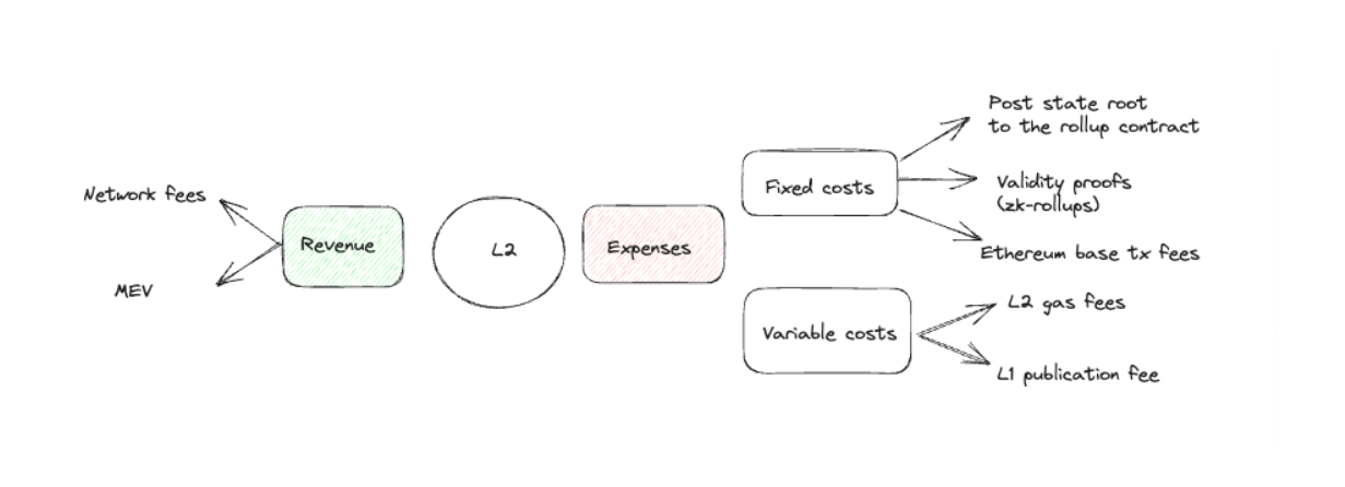 On the cost side, rollups encounter both fixed and variable expenses. Fixed costs arise from actions such as posting the state root to the rollup smart contract, validity proofs in the case of ZK rollups, and Ethereum’s base transaction fees. Variable costs encompass L2 gas fees and an L1 publication fee necessary for storing batch data on Ethereum.
