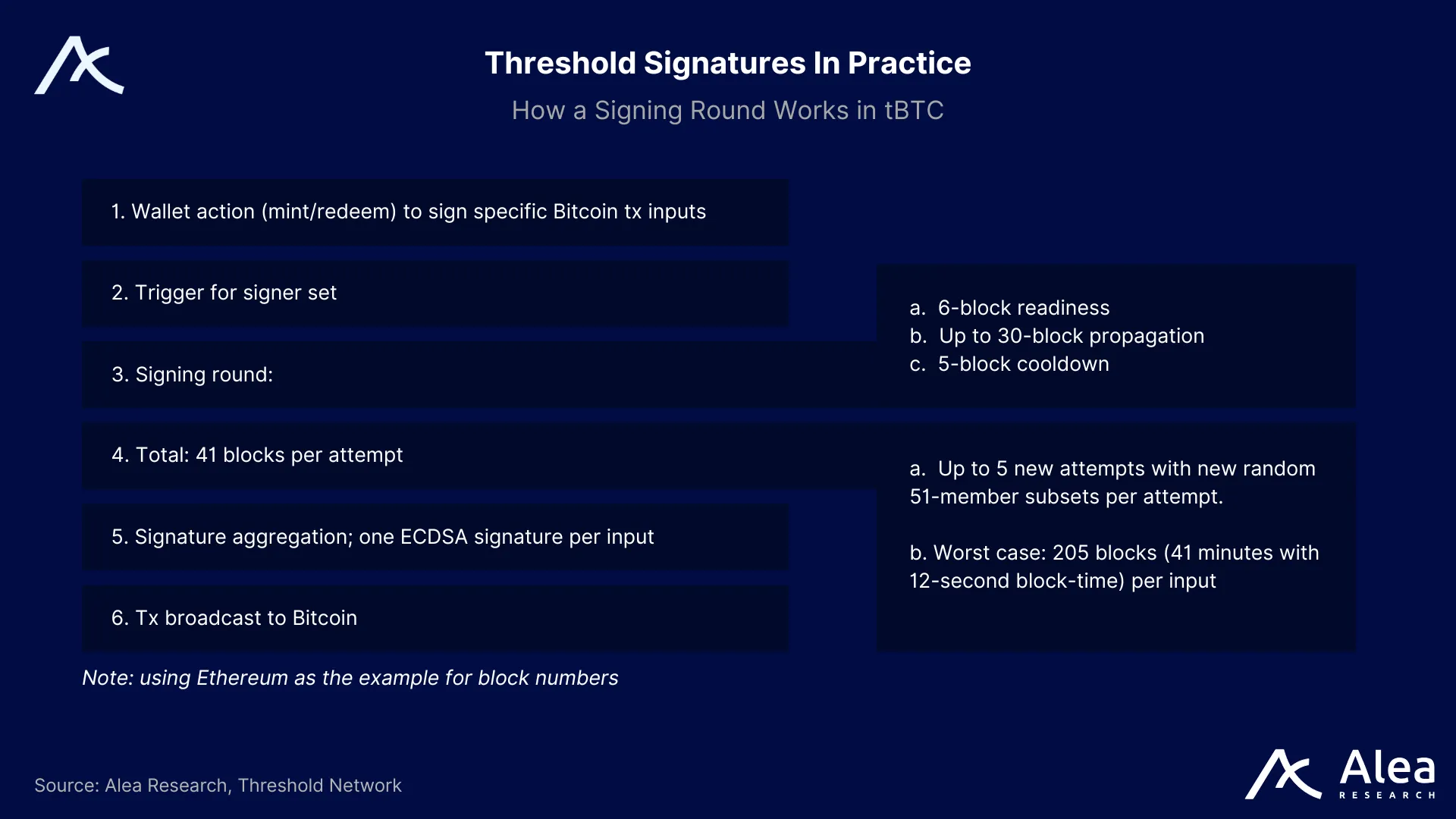 tBTC holds bitcoin (BTC) in Bitcoin wallets whose private keys never exist in one place. Each wallet is controlled by a signer set of 100 nodes, and any 51 of them can jointly produce a standard ECDSA (Elliptic Curve Digital Signature Algorithm) signature to move the coins. On the destination chain, Threshold verifies the Bitcoin transactions with SPV (Simple Payment Verification) proofs that confirm when the network can mint/burn tBTC.