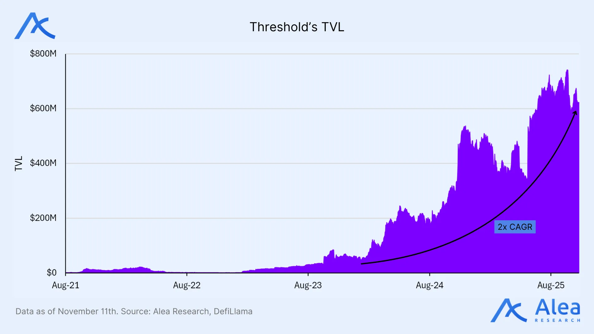 Spot BTC ETFs have grown fast, now holding ~800k+ BTC with single‑issuer AUM in the ~$90–100B range. Those passive flows, however, are simply warehoused under qualified custody. TradFi-inspired vehicles simply deliver price exposure—the inventory is secure but static. Threshold enhances BTC’s utility, making it redeemable, collateral-ready, yield-bearing, and DeFi-composable across chains.